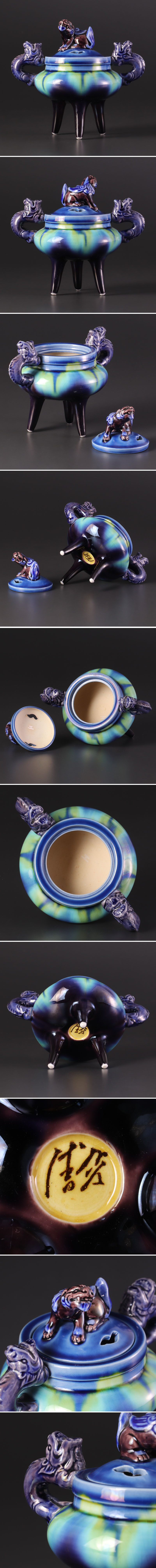 三代徳田八十吉ならではの、深く鮮やかな耀彩が目を引く三足香炉です。 一際目を引く美しいグラデーションは、光の当たり方で表情を変え、見る者を飽きさせません。獅子を象った緻密な蓋の造形や、双龍の耳など、細部にまで職人技が宿る格調高い仕上がりです。底面には確かな筆致で描き銘が記されています。 空間を彩る美術品として、またコレクションの核として、ぜひお手元でその唯一無二の輝きをご堪能ください。 ※箱はございませんのでご了承ください。 ★商品は三代徳田八十吉の作品である事を保証致します。 |