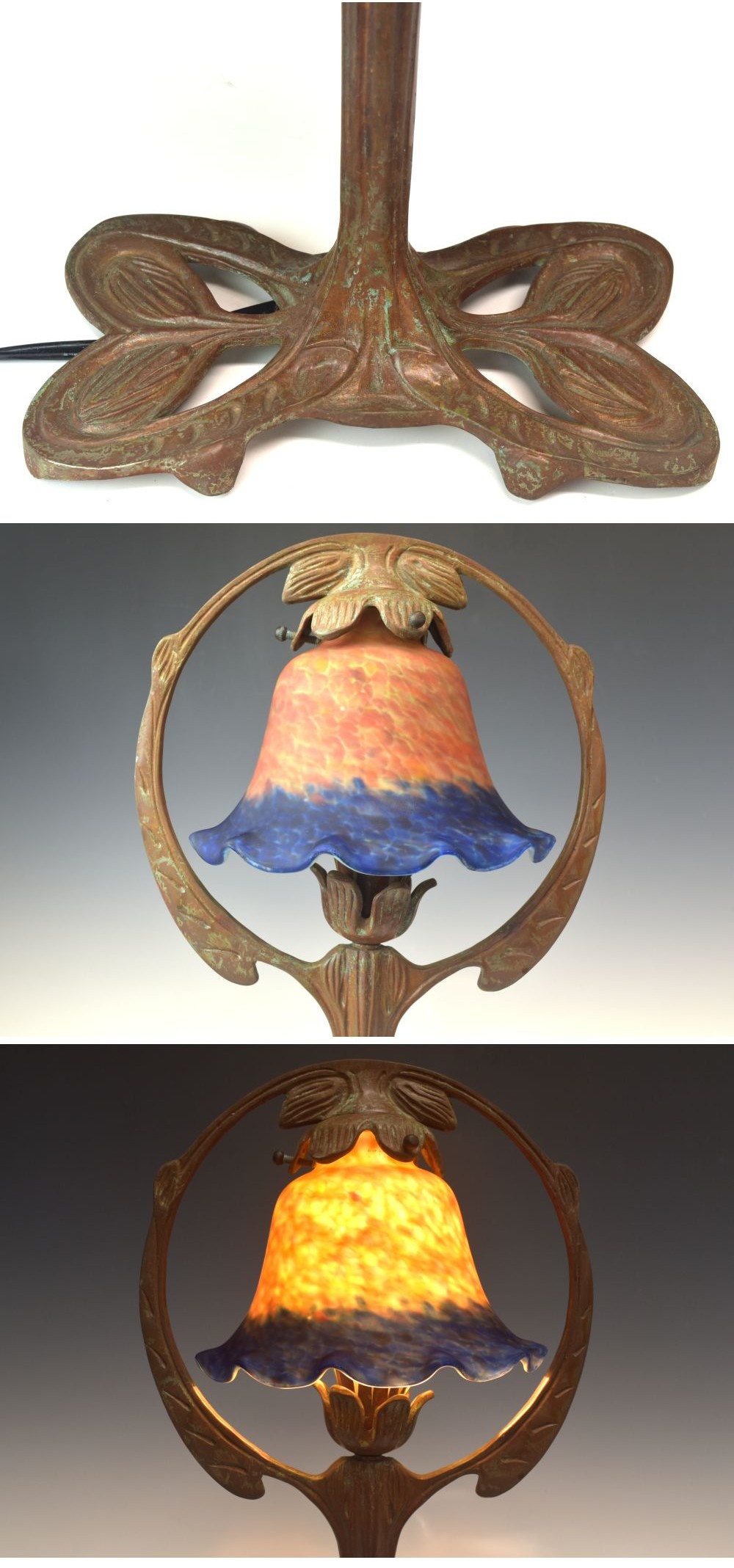 | 商品名 | 時代 アールヌーボー様式 ブロンズ台ガラススタンドランプ 高さ44cm 卓上ランプ J2251【趣楽】 | ||
