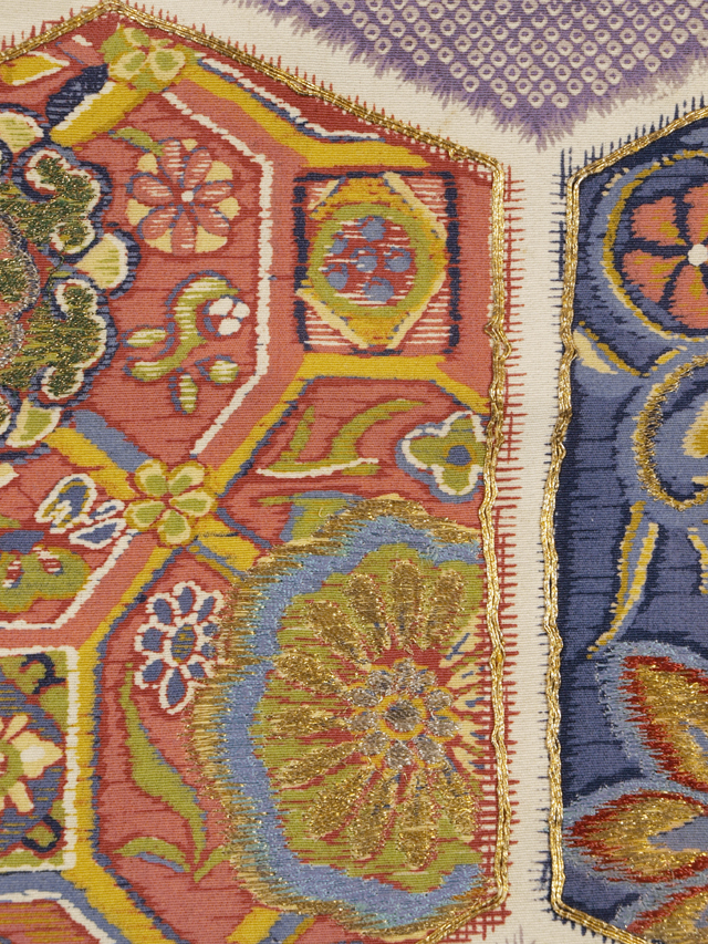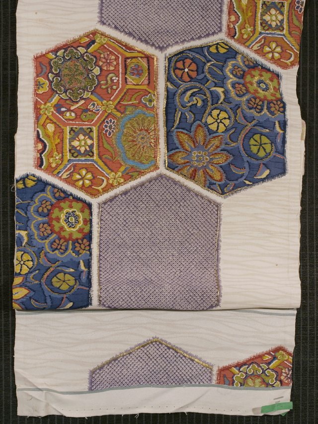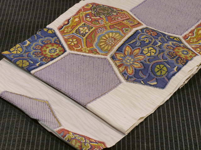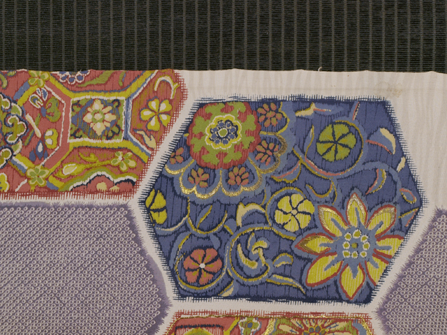 ややきなり色がかった白色の地に、淡い練(ねり)色のよろけ縞と鹿子(かのこ)や更紗調の唐花草などの小紋の配されたやぶれ亀甲の文様が染められている、縮緬の袋帯の解きです。 昭和初期ごろにつくられたと思われるアンティークのお品です。文様の一部には金駒刺繍や刺繍が施されています。 クリーニング済みで帯端にタグが付いています。縫い跡にこまかなうすよごれが数か所、お太鼓の裏に回る部分に直径約 5mm のうすよごれが 1 か所あります。アンティークなりの全体的なうっすらとしたくすみやこまかなうすよごれなどはあるかもしれませんが、そのほかに目につく大きなしみやよごれ、褪色などのダメージはなく、この時代のものとしてはきれいな状態です。お仕立て直しをされてもご着用いただけると思われますが、状態ランク=「D」のご着用対象外、リメイク素材用とさせていただきます。 |