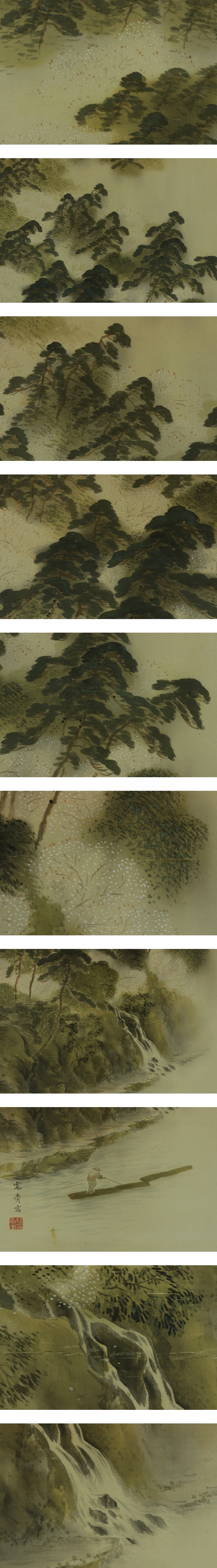 森寛斎 もり-かんさい(1814-1894) 日本画家。山口県生。 名は公粛、字は子容、別号に晩山。森徹山の門に入り、その養子となる。 幕末には尊王派として国事に奔走、維新後は京都で如雲社に参加し、塩川文麟歿後、 その中心的存在となった。また京都府画学校の教授を務め、京都画壇の重鎮として、 野村文挙・山元春挙らの門人を育成する。 帝室技芸員。明治27年(1894)歿、81才。 本紙は、染み痕があります。 表装は、良好です。 【サイズ】 作品 横約41cm×縦約125cm 表装 横約54.5cm×縦約203cm |