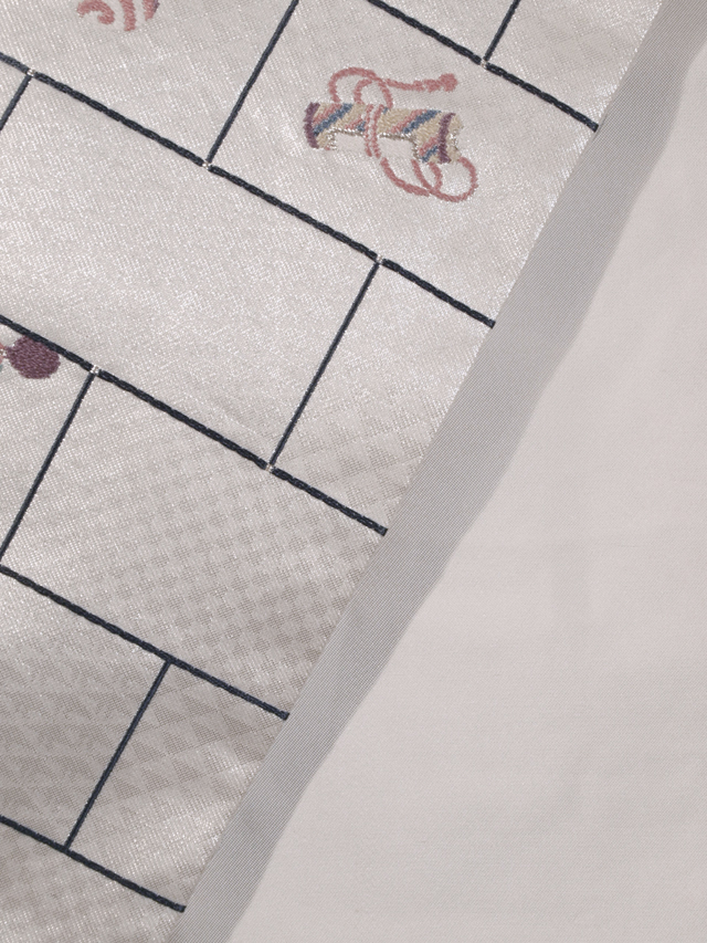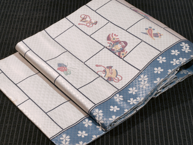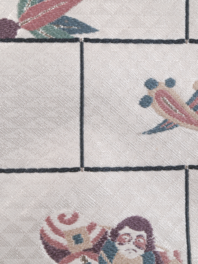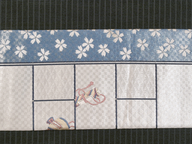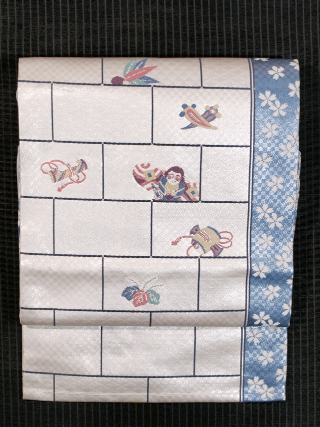 | 詳細 | 全体的な印象としては白銀色といった感じの地に市松格子縞と鱗(うろこ)の地紋が織り出され、玩具(おもちゃ)と宝尽くしの配された一の字つなぎ文様と、淡い薄花色の地に桜の配されたたて縞の文様が織り込まれている、引箔の西陣織の名古屋帯です。 奴凧(やっこだこ)や羽子板の羽などの玩具の文様がお色目も良く、とてもかわいらしいです。ややどっしりとしたとても質の良い織地です。 ユーズド品で、うっすらとした結びじわがあります。たれの下端中央左寄りの裏に直径約3cmの黄変が 1 か所あり、表のへり付近にも長さ約 3cm ほど広がっていますが、ごくうっすらとしたもので、それほど目にはつきません。また同じくたれの左端のへりに直径約 1~3mm のごくうっすらとした黄変が 3 か所ありますが、こちらも同様に目にはつきません。胴回り内側の柄抜け部分に長さ 1~3cm の色うつりとよごれが 4 か所程度ありますが、ご着用時には隠れるので気にはなりません。そのほかに目につく大きなしみやよごれ、褪色などのダメージもないので、気にされない方であれば、ご着用は可能と思われます。 |