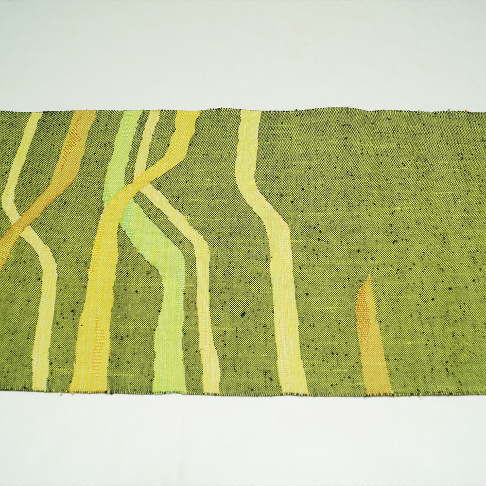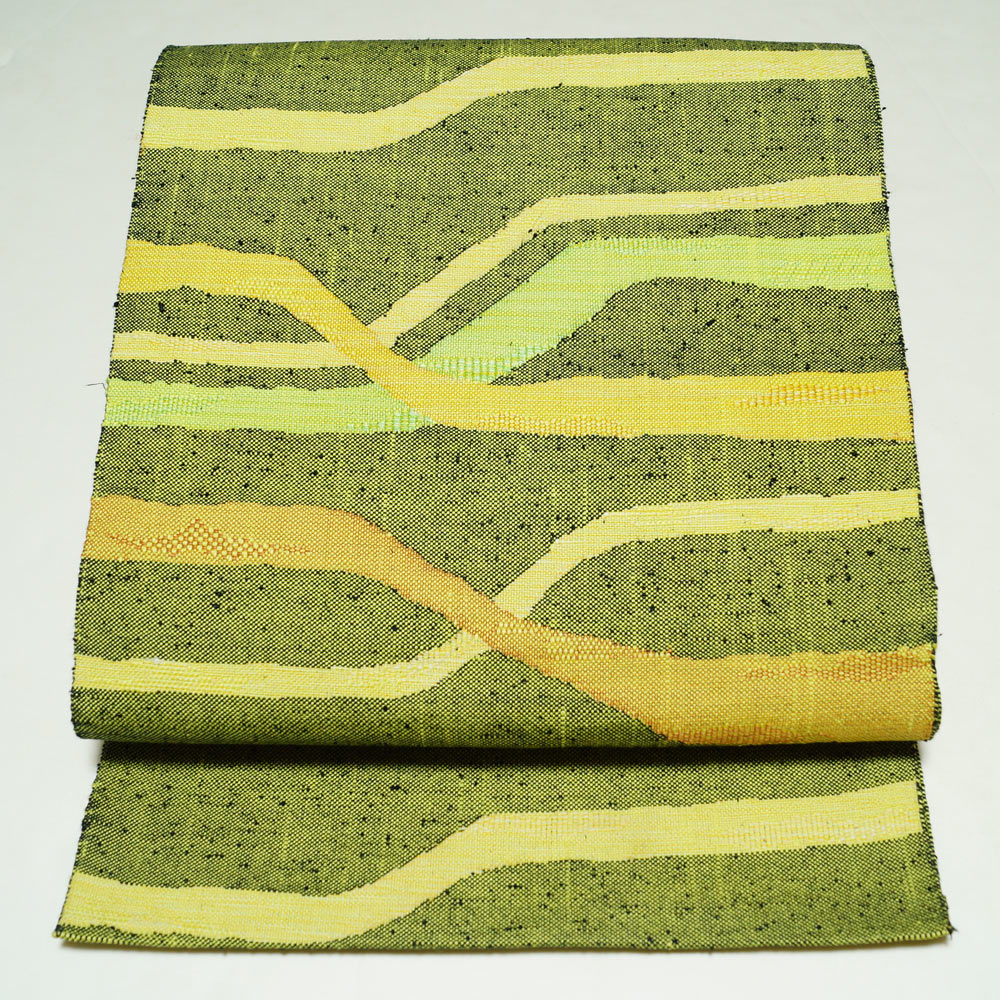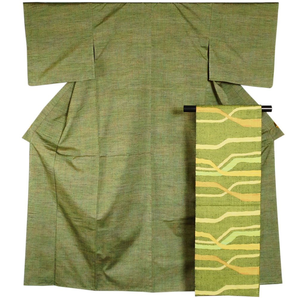 | 商品説明 | 草色系の地に破れ縞模様が織られた紬と、苗色・黒色系の交ぜ織りの紬地に抽象的なライン模様が織られた八寸名古屋帯の2点セットです。 | ||