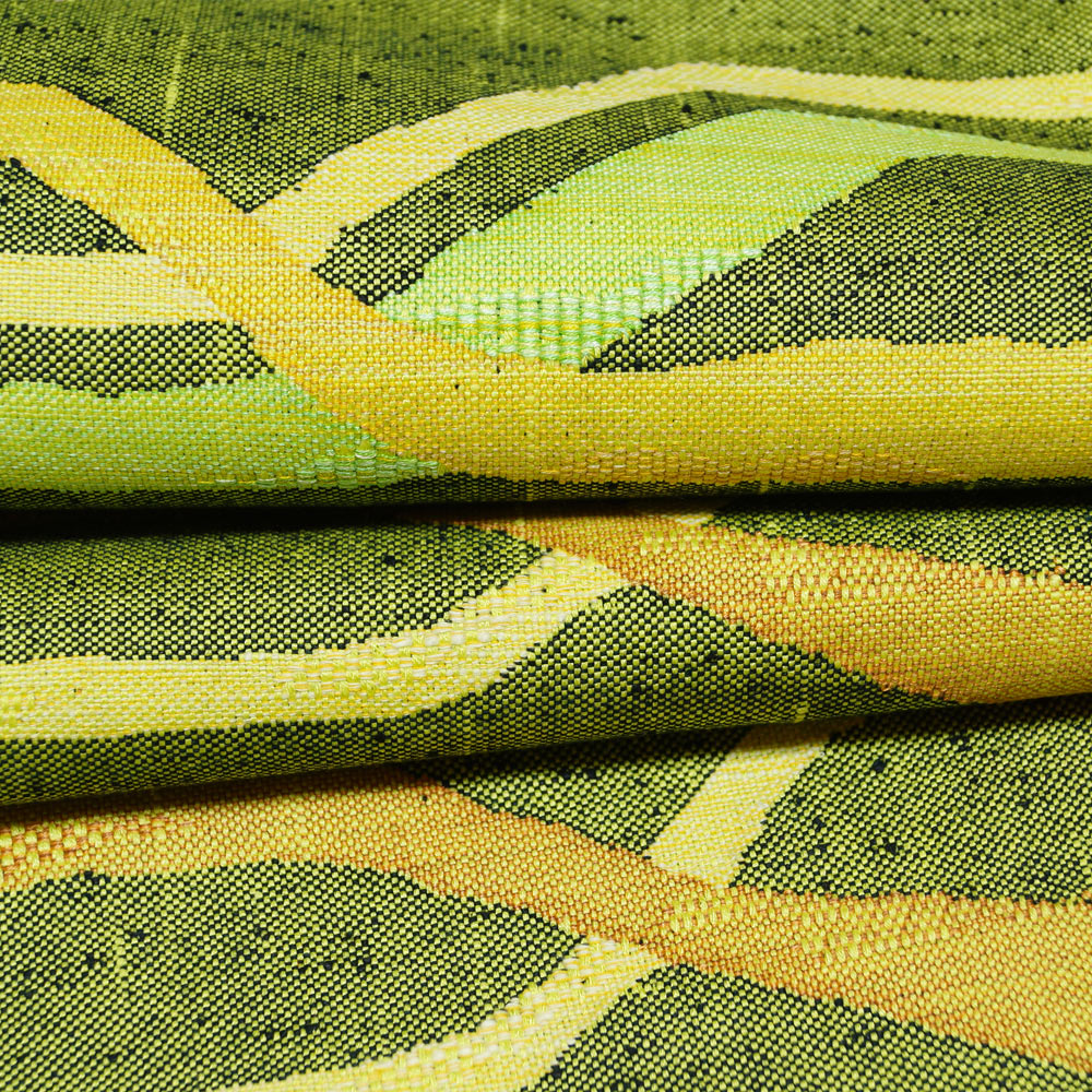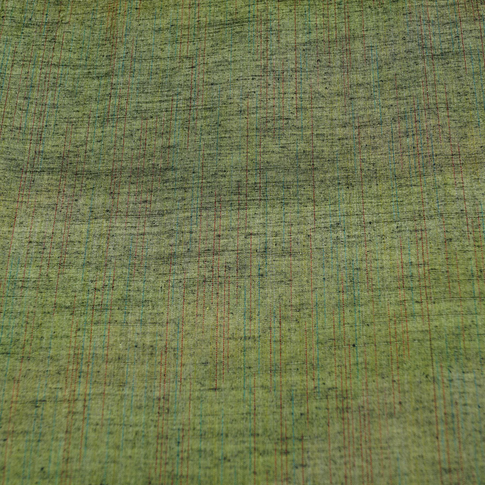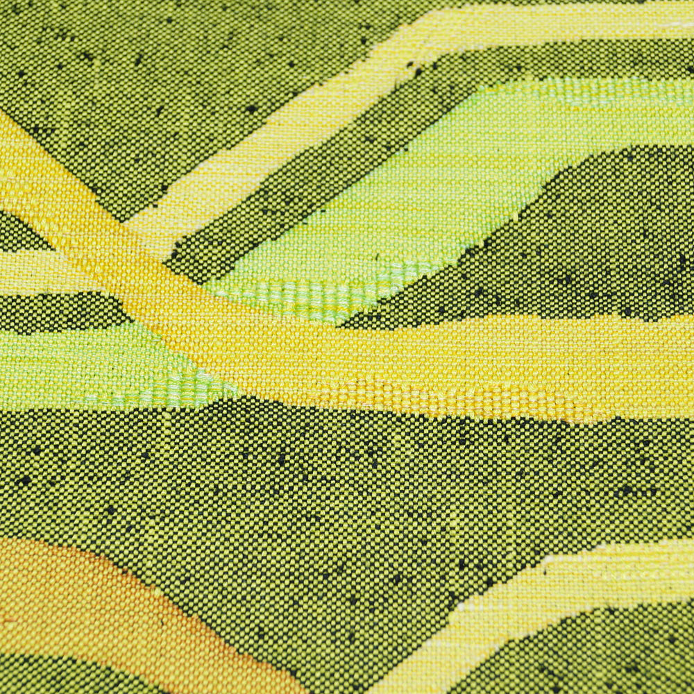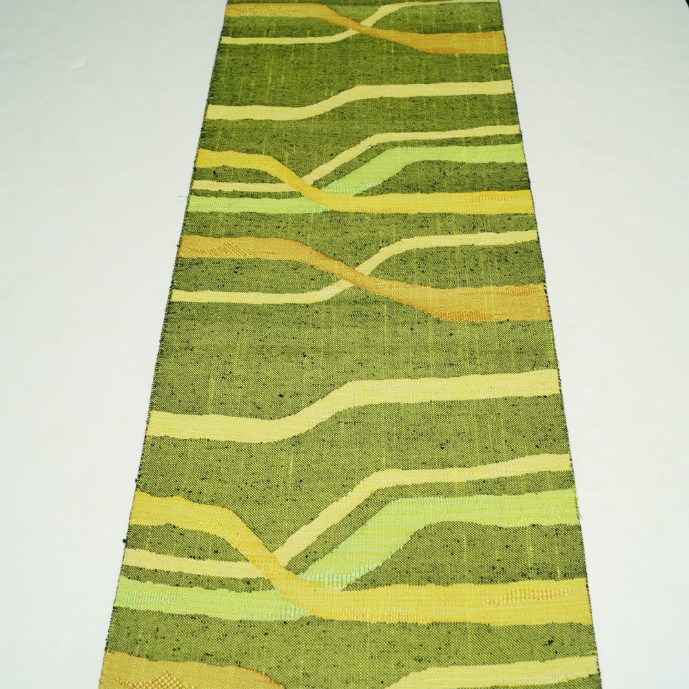 | 商品説明 | 草色系の地に破れ縞模様が織られた紬と、苗色・黒色系の交ぜ織りの紬地に抽象的なライン模様が織られた八寸名古屋帯の2点セットです。 | ||