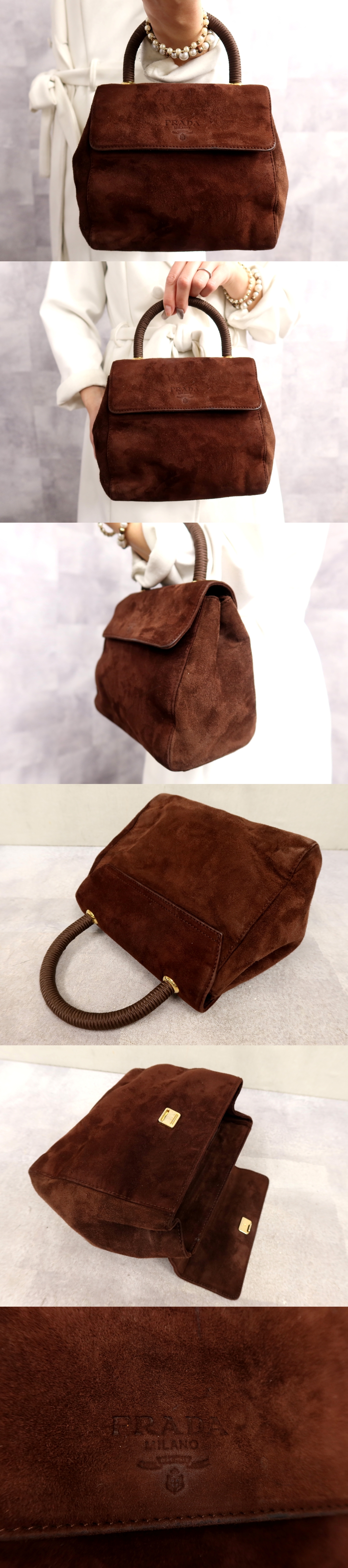●超美品●PRADA プラダ●ロゴ型押し●スエード レザー 本革●ハンド バッグ●ブラウン●ゴールド金具●腕掛け●イタリア製●収納●Js64904 收藏