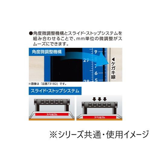 | 角度微調整機構とスライド・ストップシステム※を組み合わせることで、mm単位の微調整がスムーズにできます。スライダー(別売)用溝付です。溝に合わせて滑らせるだけで切断時のズレが防げます。 ※通常はスベリ止ゴムが浮いている為、スムーズにスライドできます。 ※取手を押さえると、スベリ止ゴム部分が下がって材料に密着し、ガッチリ固定できます。 ※スライダーは付属いたしません。 |