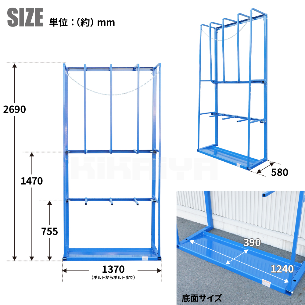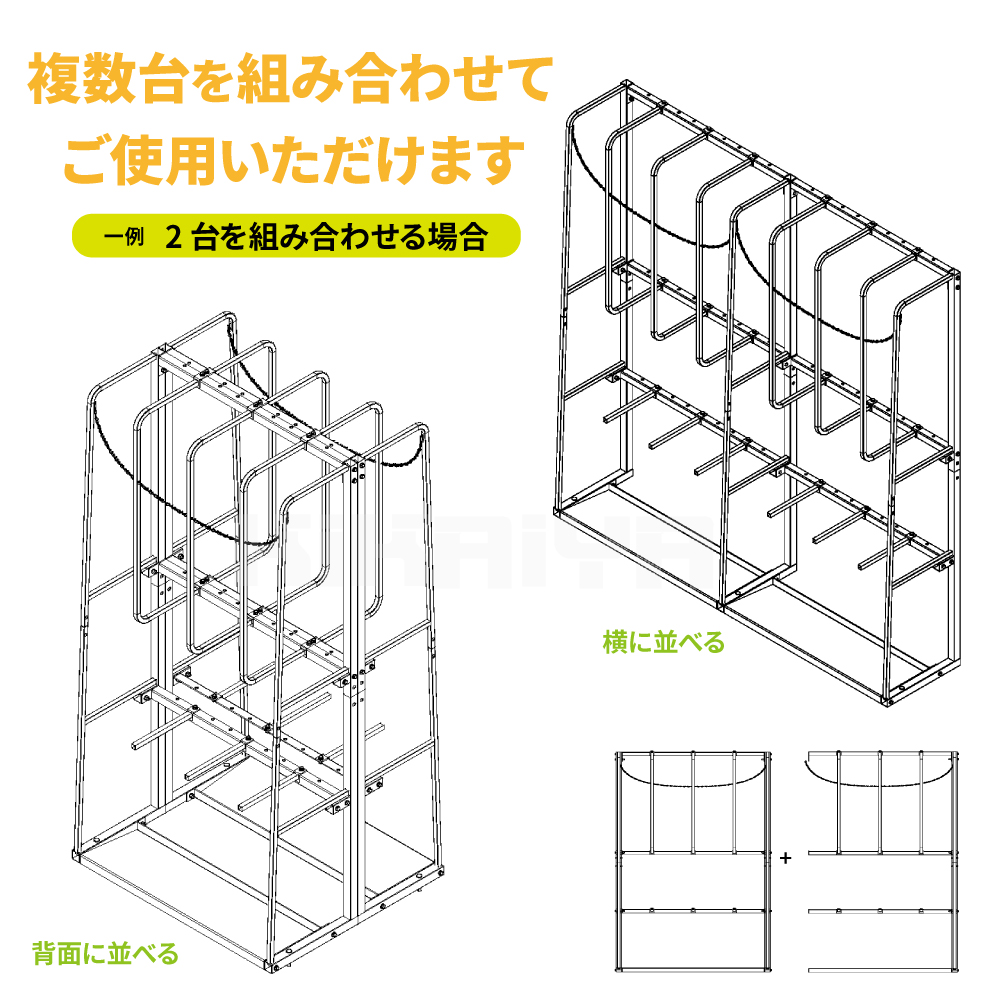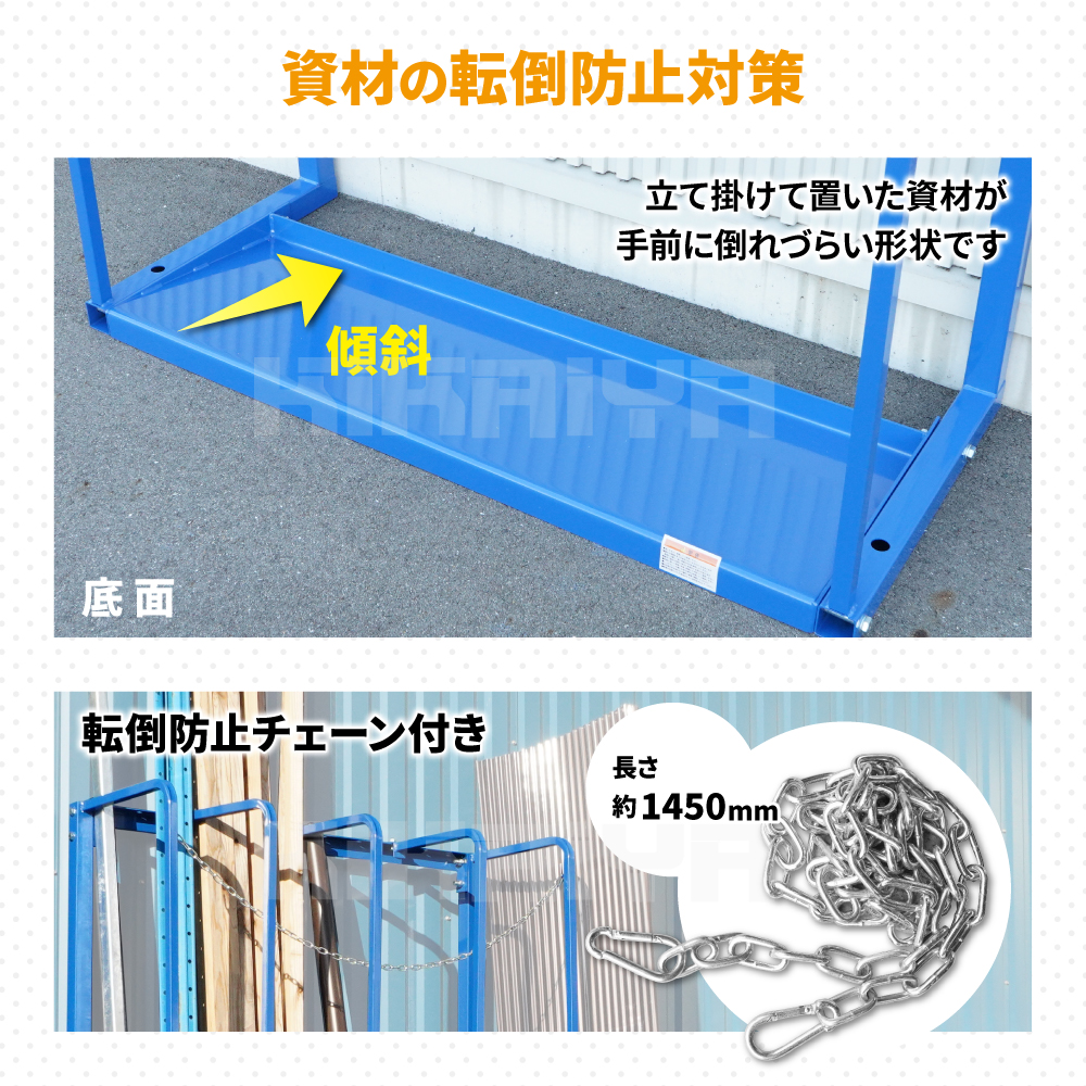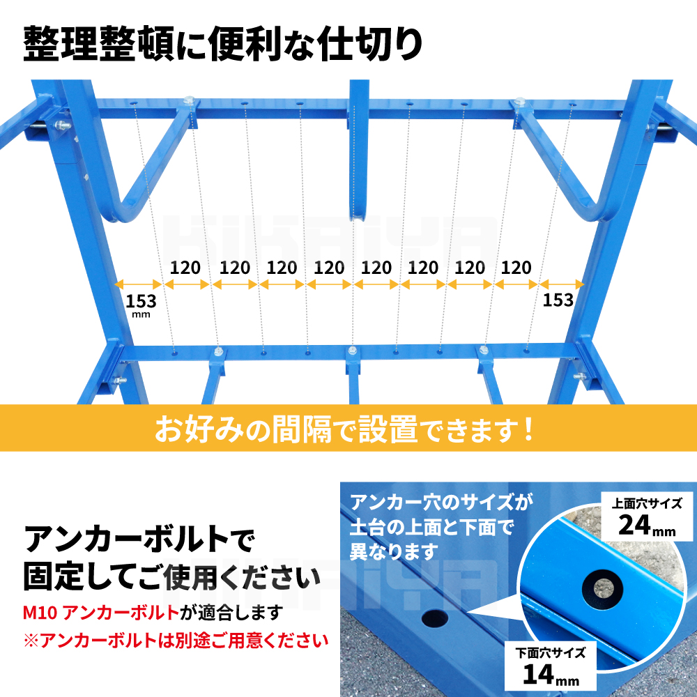 長尺物の保管スペースをコンパクトに! ●パイプ、木材等の長尺物の整理整頓に最適です ●底面は奥に向けて傾斜がついているので、 立て掛けたものが手前に倒れづらくなっています ●長尺物が転倒するのを防ぐチェーン付き ●仕切りは120mm間隔でお好みの位置に設置できます ●アンカーボルトで固定してご使用ください ※アンカーボルトは付属しません。別途ご用意ください ●複数台を組み合わせてご使用いただくことも可能です ●お客様自身で組み立てが必要な商品です 安全のため、2~3人での組み立てを推奨いたします 必要工具:プラスドライバー、インパクトレンチ(19mm) |