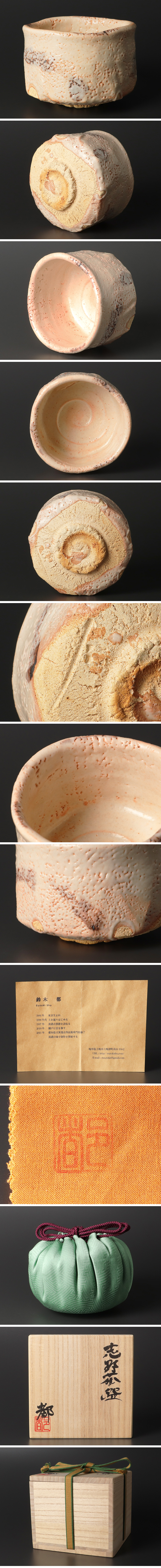 鈴木都(すずきしゅう)作の志野茶碗です。やわらかな白釉に、ほのかに桃色を帯びた志野らしい景色。釉の溜まりや細かな鉄気、火に撫でられたような肌合いが、手取りのたびに表情を変えて見える一碗です。見込みの渦の作りも穏やかで、抹茶の緑がよく映えます。 鈴木都は、美濃の古窯跡に通い、土を掘るところから制作に向き合ってきた作家として紹介されており、近年は地上式穴窯を築窯するなど、薪の焼成を生かした表現にも取り組んでいます。 本作にも、志野ならではの“白の奥行き”に加え、焼成由来の素朴で力のある気配が感じられ、茶席の主役としても十分に映える出来栄えです。 ★商品は鈴木都の作品である事を保証致します。 |