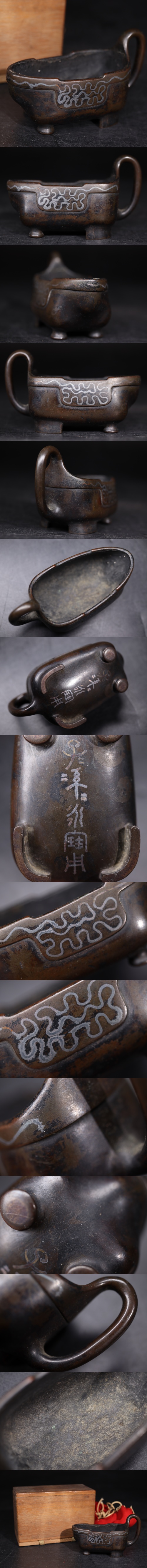 | 底款 古銅 銀象嵌 急須 仕覆 木箱付 / 中国美術 銅 彫金 金工 茶器 煎茶道具 .G3523 |