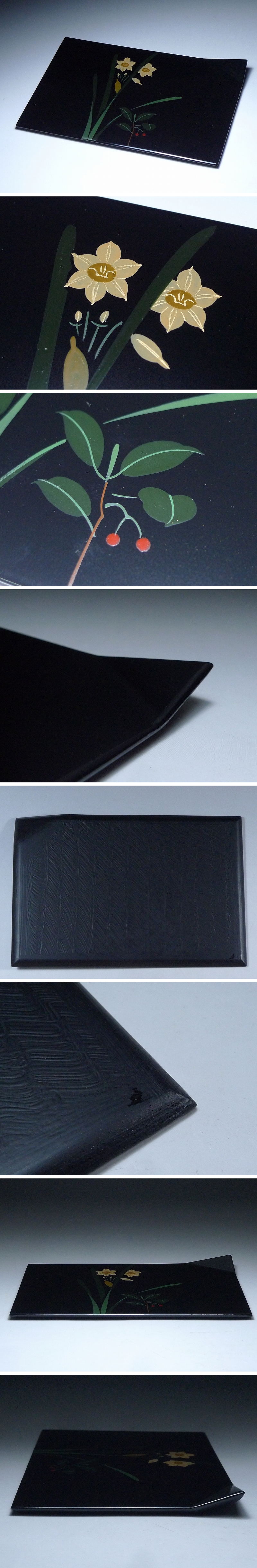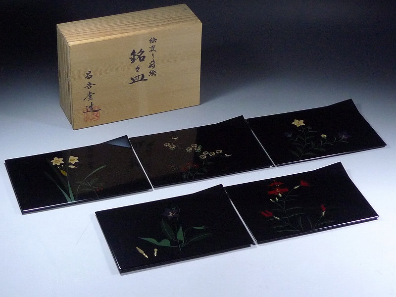 60TR131★昌吾堂造 黒塗 草花文 絵変り蒔絵 銘々皿 5客揃 共箱付 菓子皿 茶道具 漆器 漆塗 310/3200 收藏