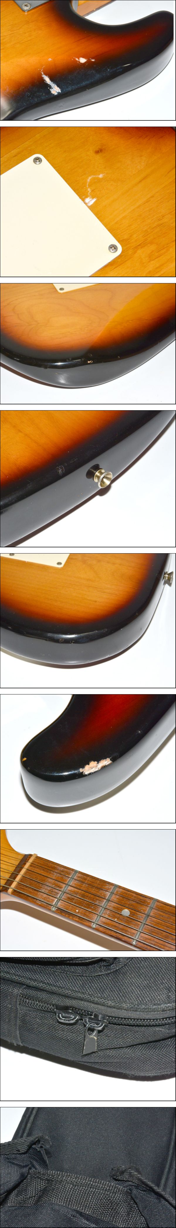 こちらはUSED品です。 ・ボディ正面、側面、底面に多少のスレ、キズ、打痕、塗装はがれ、塗装がはがれた部分に黒く塗られたような跡が見られます。 (画像にてご確認ください。) ・ボディ背面にスレ、キズ、打痕、塗装はがれ、削れが見られます。 (画像にてご確認ください。) ・ネックに多少のスレ・打痕、小キズが見られます。 ・ネックジョイントに僅かな塗装クラックが見られます。 ・ヘッドに多少のスレ、小キズが見られます。 ・指板にスレ、キズが見られます。 ・ペグ・ブリッジ・ジャック等金属部分に多少のスレ・汚れ、小キズが見られます。 ・ピックガードにスレ、キズが見られます。 ・ピックアップにスレ、小キズ、多少の汚れが見られます。 ・ノブ、セレクタースイッチに多少のスレ、キズ、汚れが見られます。 ・ネジに多少のスレ、小キズ、僅かなサビが見られます。 ・ネックプレートに多少のスレ、キズが見られます。 ・バックプレートに多少のスレ、キズ、打痕が見られます。 ・ケースにスレ、キズ、汚れ、ほつれ、破れ、本体ファスナーの持ち手部分の欠損が見られ、 ストラップと本体のつなぎ目がほつれて取れかけています。 全体的にキズ、多少のスレ、打痕、塗装はがれ等が見られますが 上記の点以外に目立つキズ、ダメージ等は見られない状態です。 ネックはやや順反り傾向です。 (現在の弦高は12Fで、1弦側:約2.0mm、6弦側:約2.5mm) 重量:約3.5kg、ナット幅:約42mm、スケール: 約646mm |