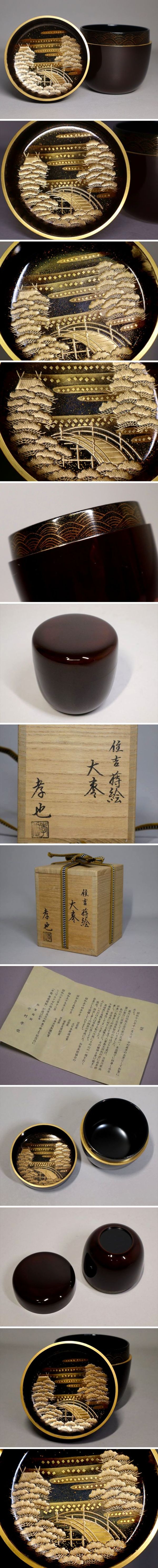 状態良好でとても綺麗です。上品な雰囲気の溜塗に、華やかな住吉蒔絵が施された作品です。立体的な高蒔絵に切金のアクセントが大変美しいです。立上がりには梨子地に波の蒔絵が描かれており、細かい所まで手が込んでいます。落ち着いた雰囲気で使い勝手も大変良い棗です。