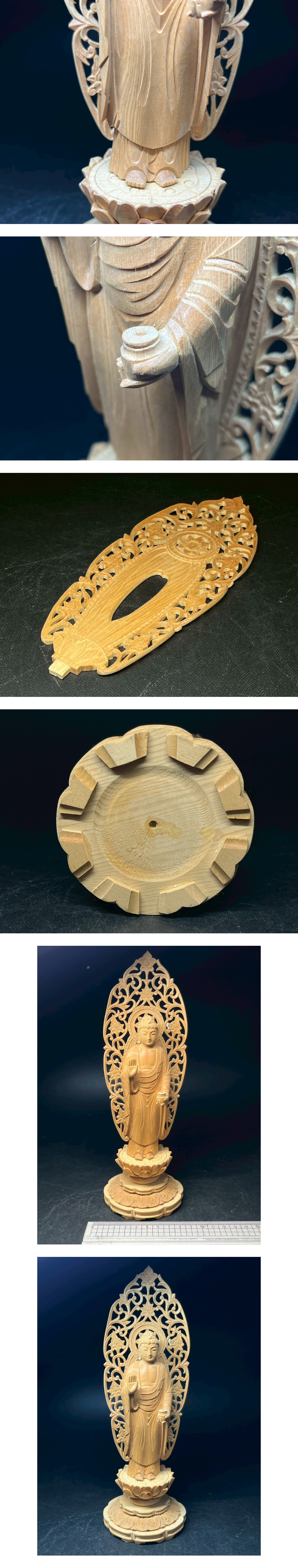 ●【極上品】薬師如来 立像 木彫 仏像 繊細透かし光背 蓮華座 総高25cm 仏教美術 細密彫刻 祈祷仏 骨董 時代物 手彫り 一刀彫 ■サイズ:横幅 8cm/縦幅 8cm/高さ 25cm ※素人寸法の為、若干の誤差はご了承ください。 ■状態につきましては経年に伴うスレ・汚れ・小キズ などが見られます。 ※その他の細かな状態は写真にてご確認・ご了承の上 ご入札くださいませ。 ●こちらの商品などは時代物や古いお品・骨董品となり ますので、細かな状態を気にされる方・神経質な方の ご入札はご遠慮くださいませ。 |